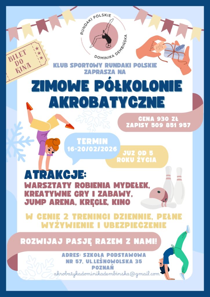 Zapraszamy wszystkie dzieci od 5. roku życia na zimowe półkolonie akrobatyczne organizowane przez Rundaki Polskie – Akrobatyka Dominika Dembińska!
